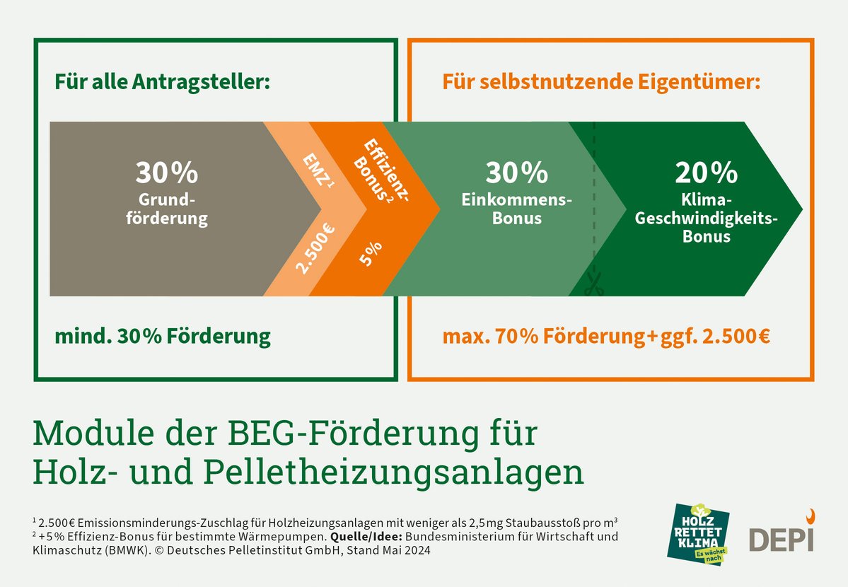 Der hohe Fördersatz besteht aus mehreren Komponenten: 30 Prozent gibt es als Grundförderung. Weitere 20 Prozent übernimmt der Klimageschwindigkeits-Bonus für selbstgenutzte Eigenheime, in denen beispielsweise fossile Heizsysteme ausgetauscht werden. Haushalte mit einem zu versteuernden Jahreseinkommen unter 40.000 Euro erhalten zusätzlich einen Einkommens-Bonus. So lassen sich bis zu 70 Prozent der Kosten erstatten. Für besonders emissionsarme Pelletheizungen mit Staubwerten unter 2,5 Milligramm pro Kubikmeter Abluft gibt es ergänzend einen pauschalen Zuschuss von 2.500 Euro.